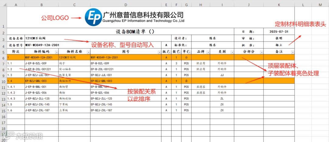 如上图所示,通过意普独家开发的PDM工具实现一键自动生成套用企业标准设备清单模板的材料明细表,其中包含公司的LOGO,而列表头设备名称,设备型号,修订版,生成日期,审批人员则根据总装配体数据卡内容自动写入,并且顶层装配体与子装配体使用亮色显示,以此区分零件。