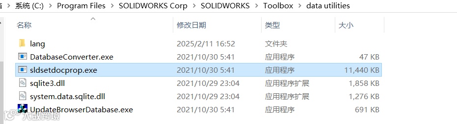 (1)打开本地SOLIDWORKS的安装目录,一般默认在C盘:C:\Program Files\SolidWorks Corp\SolidWorks\Toolbox\data utilities\sldsetdocprop.exe,通过sldsetdocprop.exe工具修改零件的属性。