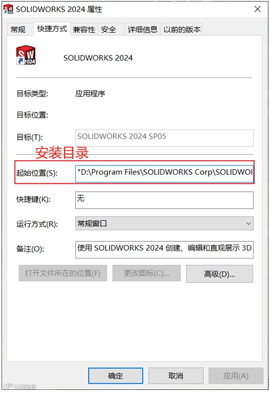如果不清楚SOLIDWORKS的安装目录,可以右键单击桌面图标,点击属性。起始位置所在的路径就是安装目录。