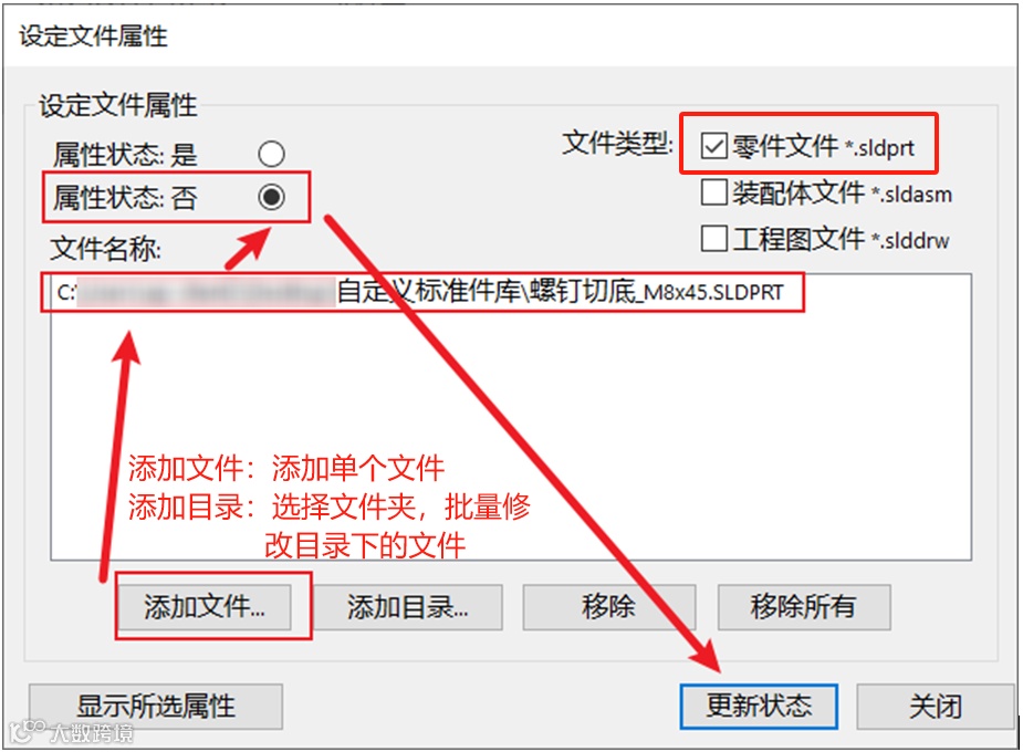 (2)通过添加文件或目录,浏览到新创建的非标螺钉,设定文件属性状态为”否”,然后点击【更新状态】完成属性更改