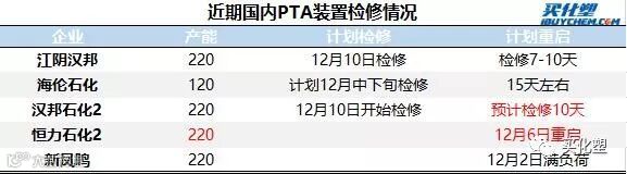 12月底恒力及中泰的共计370万吨/年新PTA装置大概率全部投产,PTA供应将大幅增加。目前可运行PTA装置除汉邦220万吨/年、佳龙石化60万吨/年装置停车之外几乎全部正常运行,而汉邦220万吨/年仅停车10天,多数PTA装置在9-11月已经检修过,12月可能再无PTA装置检修利好。