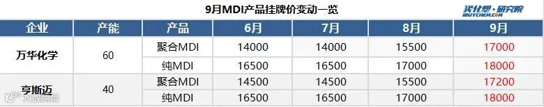 上海亨斯迈2020年9月纯MDI桶装/散水挂牌价18000元/吨,较8月挂牌价格上调1000元/吨。