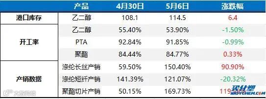 五一假期之后,受原油提振,下游聚酯及终端工厂开始集中补仓,聚酯工厂产销放量,在5月4日达到最高点,日内聚酯工厂平均产销数据达到200%以上,市场商谈价格连续上调。