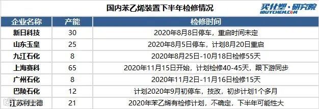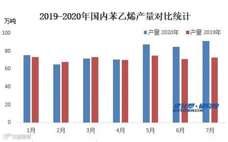 从目前产量数据来看,2020年国内苯乙烯月产基本均高于去年同期,尤其是7月份,产量高达91.13万吨,按照当前工厂开工及未来检修预期情况来看,8-10月份国内苯乙烯产量仍将维持一个高产出水平。