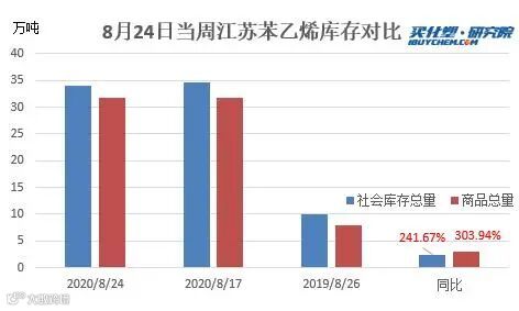 截止至8月24日,江苏苯乙烯社会库存量在34.03万吨,环比减少0.67万吨,但与去年同期相比,苯乙烯库存仅为9.96万吨,同比暴涨241.67%;8月24日商品量库存在31.75万吨,环比减少-0.08万吨,与去年同期相比,苯乙烯库存仅为7.86万吨,同比去年涨303.94%。