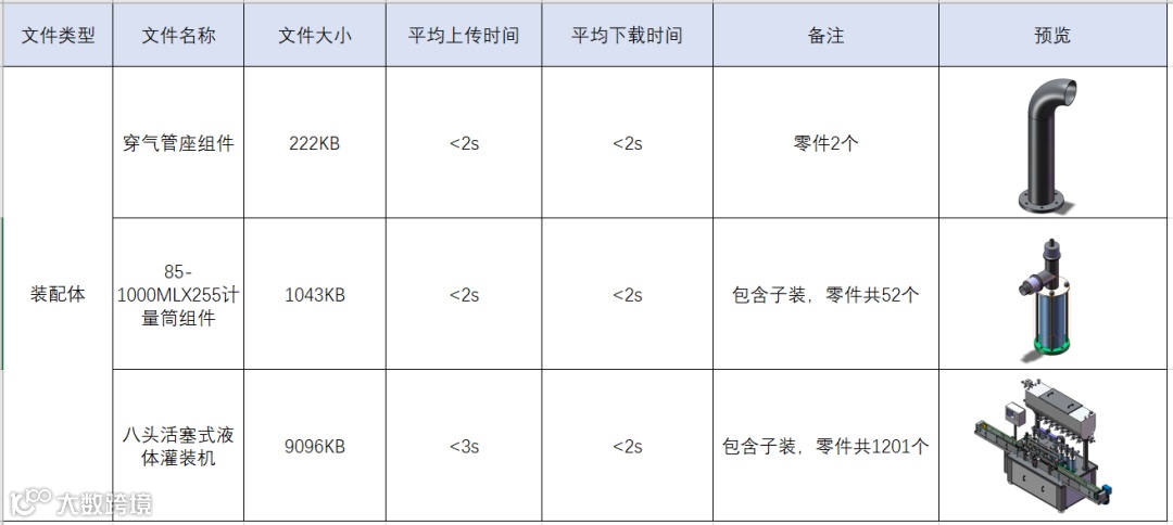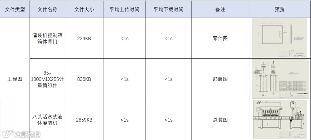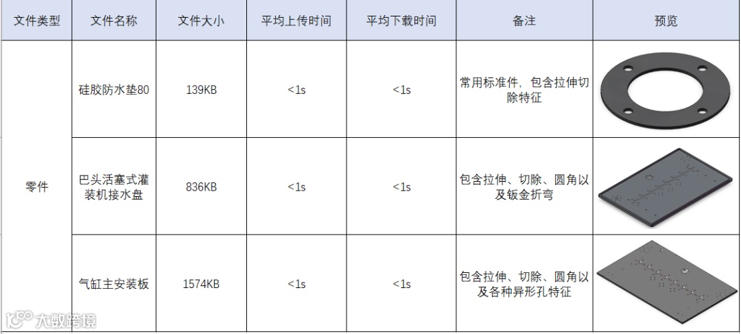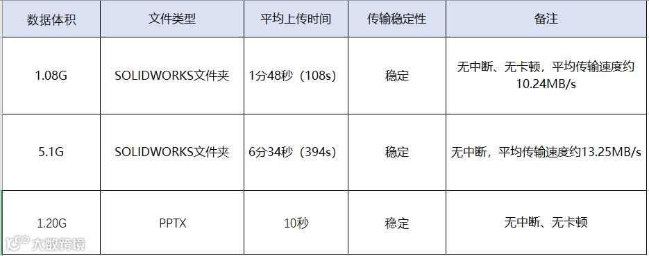 本次测试分为4个模块:一般零件上传下载、工程图上传下载、装配体上传下载、1G/5G超大体积数据上传(下载因日常使用频率较低,重点测试上传),所有测试结果整理如下,清晰直观。