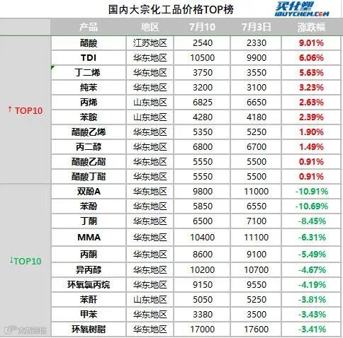 跌幅前三的产品分别是双酚A、苯酚、丁酮,跌幅分别为-10.91%、-10.69%、-8.45%。