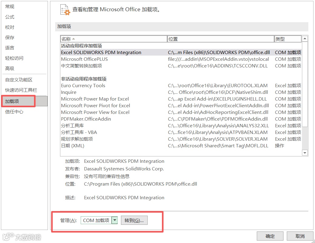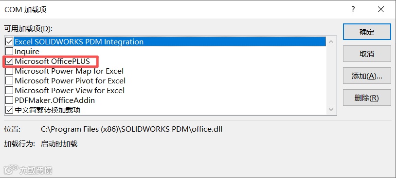 3、勾选其中的Microsoft Office PLUS加载项,点击确定,然后安装该程序。这样之前的报错就不会出现,用户就可以正常使用SOLIDWORKS设计表了。