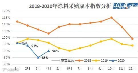 据买化塑研究院涂料采购成本指数显示,2020年4月指数为90%,环比上升5个百分点,