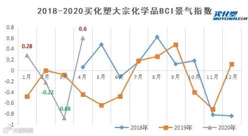 据买化塑研究院监测,4月BCI大宗化工品景气指数为+0.6,市场景气度同3月相比出现大幅提升。从历史数据上来看,往年春节过后市场会迎来采购高峰,市场景气程度也随之提升,但今年受疫情影响,一季度市场操作气氛大幅下滑,直至4月份随着疫情得到有效控制,并在复工复产带动之下,二季度首月化工市场迎迟来的“小阳春”。