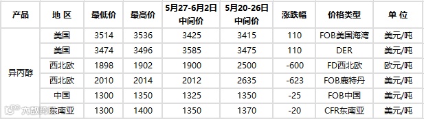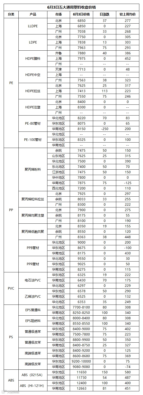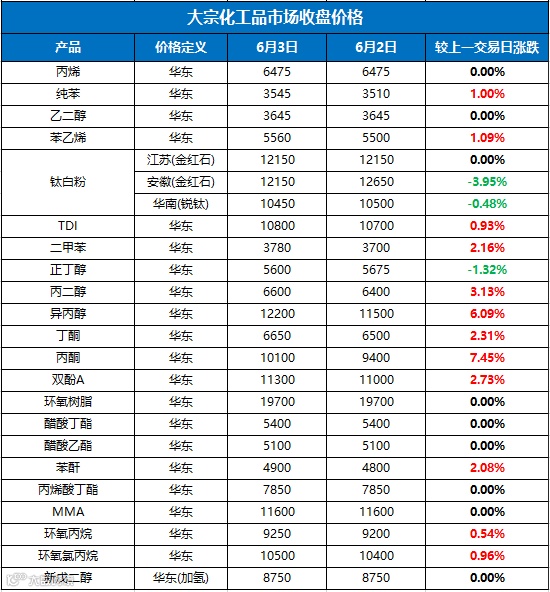 | 产品 | 相关产品 | 市场 | 6月3日收盘 | 6月2日收盘 | 涨跌 | 单位 |