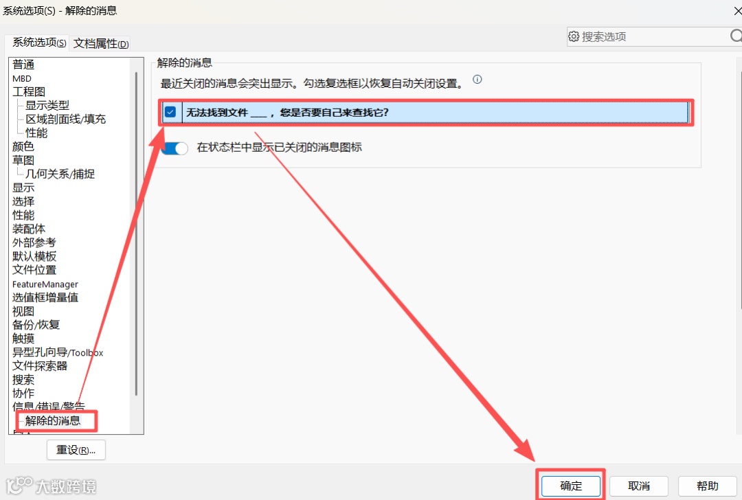 注意:如果打开时没有出现此弹窗,可以关闭工程图重新打开来触发。有可能是因为之前不小心勾选了“不要再提示”选项,你可以在【系统选项】-【信息/错误/警告】-【解除的消息】中重新勾选“无法找到文件_____您是否要自己来查找它?”消息