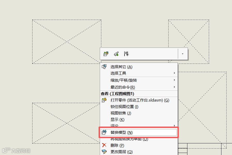 a) 在空白的工程图视图区域右键单击,选择“替换模型”选项