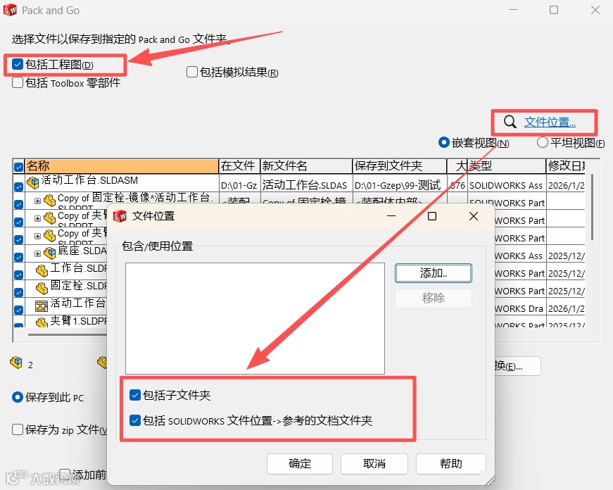 l 同步传输文件:传输工程图时务必同时发送或保存对应的模型/装配体文件,可以使用Pack and Go 打包工具,将参考的文件打包传输,而不是直接在Windows资源管理器中复制粘贴