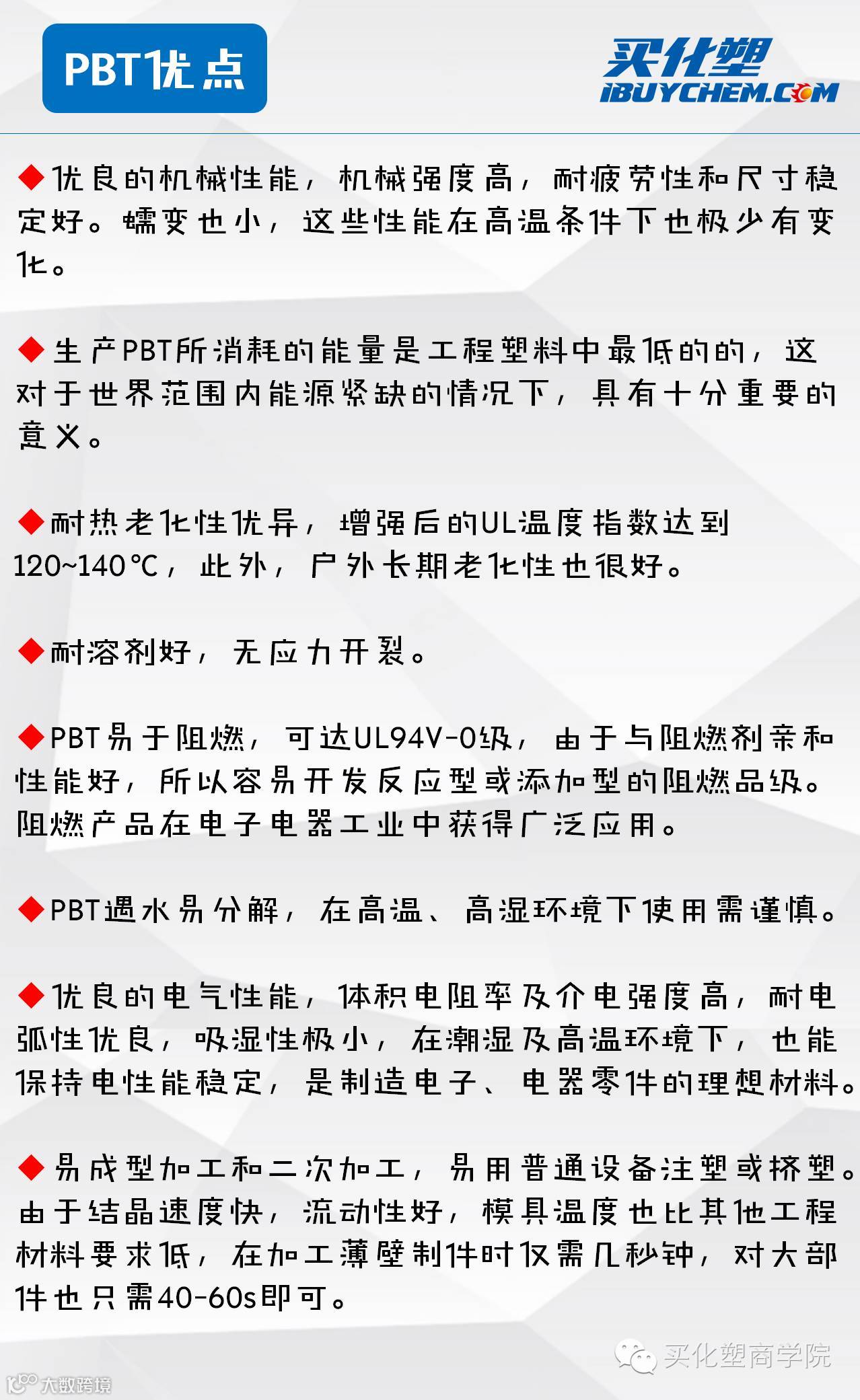关注“买化塑商学院”(微信号:MBAIbuychem),运用互联网视角洞察化工、塑料和精化产业资源,通过资讯、品牌、商贸、咨询、金融、物流仓储等信息化服务,为化塑企业提供贴近市场的供应链管理知识和培训。