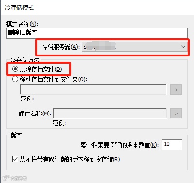 3、 选择对应的存档服务器,将冷存储方法设为【删除存档文件】。