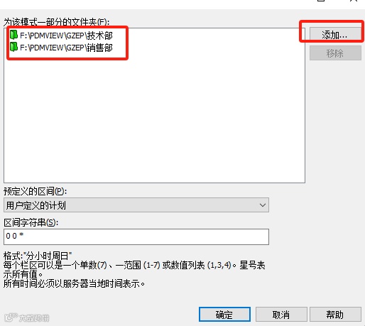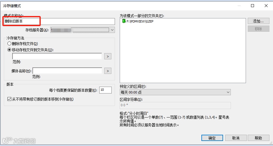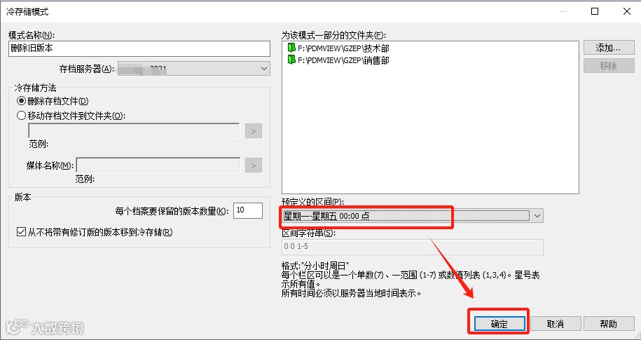 7、最后设置服务器执行此冷存储的时间,您可以自定义时间。建议设置在深夜,保证没有人正在使用PDM。此处设置为星期一-星期五0点。设置完成后,点击确定即可。系统会在对应时间内自动清除就版本。