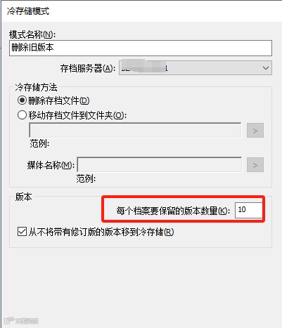 4、接下来设置每个档案要保留的版本数量,比如文件A一共有20个版本,您想要删除前面10个版本,那么此处设置的版本数量则为10。具体以您实际要删除的版本为准。此例设置为10。同时勾选【从不将带有修订版的版本移到冷存储】。