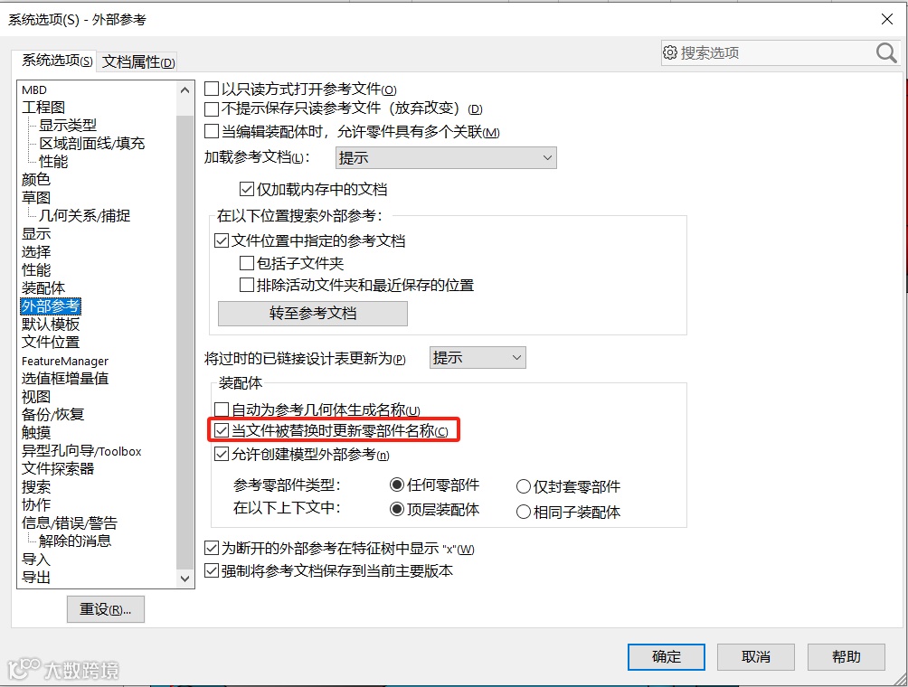 在SOLIDWORKS中的设置中勾选相关选项,使装配体的零件参考位置不会随着更新。在“工具”菜单中选择“选项”,然后在“系统选项”中选择“外部参考”,勾选“当文件被替换时更新零部件名称”选项即可。