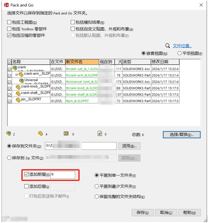 如果总装图只需文件夹B内装配体,则删除文件夹A内该装配体及其所有零部件。若两个装配体都需要,则重新打包文件夹B内该装配体,打包时需添加前缀或后缀,然后总装图重新调用打包后的该装配体。这样可以避免子装配体内零部件名相同的问题。