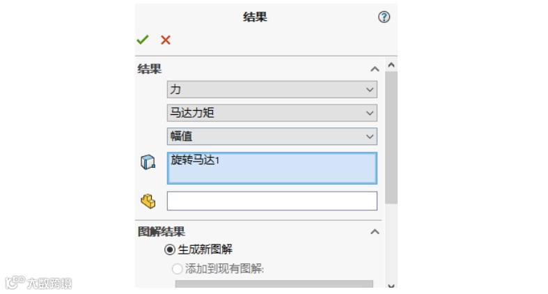 设定完毕之后,点击“计算”按钮,Motion分析将分析受力情况,计算完毕后,可在结果和图解位置显示摇臂受力情况。