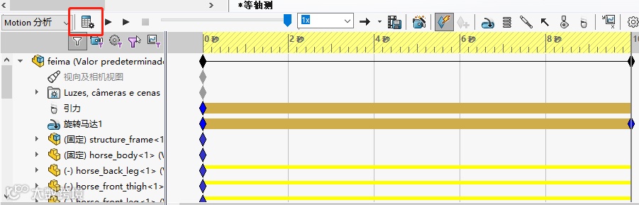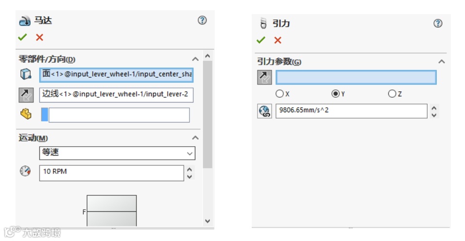 在Motion分析时,可以根据需要增加马达(动力)、重力(引力)、弹簧力、阻尼、力、接触等力情况,例如本例中需要增加马达、重力情况,如下图: