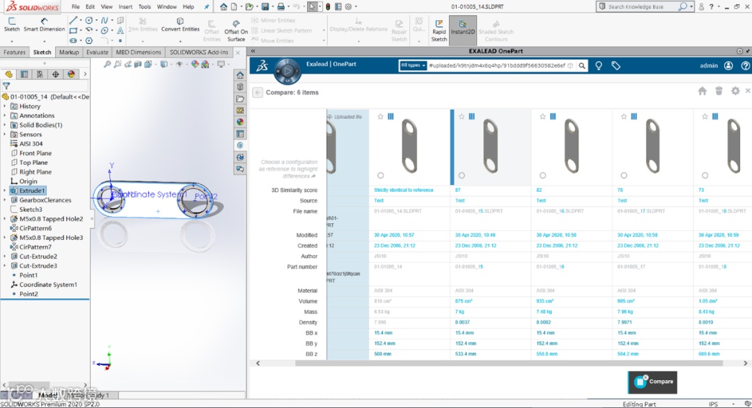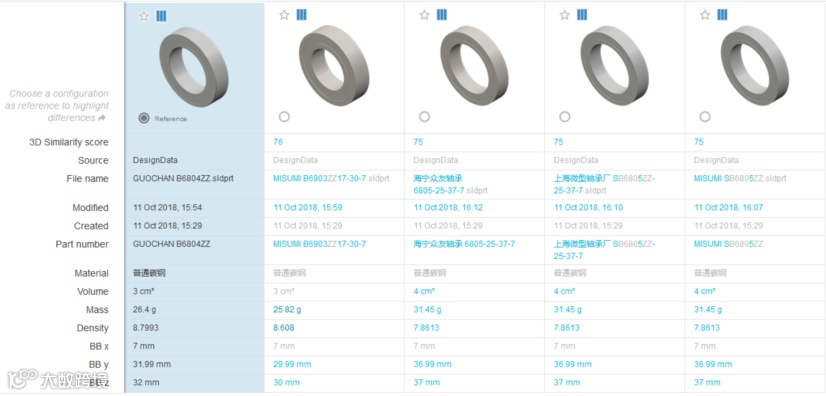 EOP准确的搜索出零件后,可以对搜索结果进行并列对比,EOP可以自动挖掘出三维模型的深层属性,例如材质,体积,密度,重量等等信息。在这些信息对比中,EOP通过高亮显示出差异部分,让工程师更加简单快速的定位到所需重用的零件。如此一来,工程师更加乐意使用已有的标准件,而不是去设计新的零件。