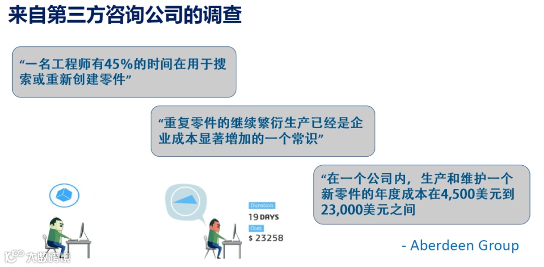 根据第三方机构的调查,一个工程师有45%的工作时间用于搜索或者重新创建零件,而正如刚才所说,重复零件的产生大大增加了企业的成本。这份报告提到,生产和维护一个新零件的年度成本达到了4500美元~23000美元。
