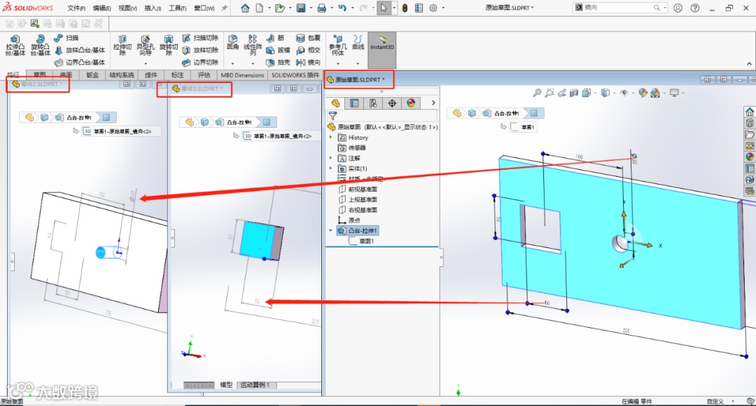 7、这时候,我们只要修改原始草图中的数据,零件2和零件3也会随之改变,如图: