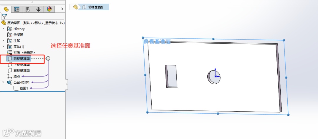2、第二步:完成草图后,生成实体,命名为原始草图,点击任意基准面,如图。