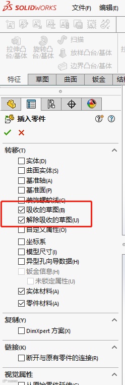 4、点击插入零件之后,勾选【吸收的草图】和【解除吸收的草图】,如图: