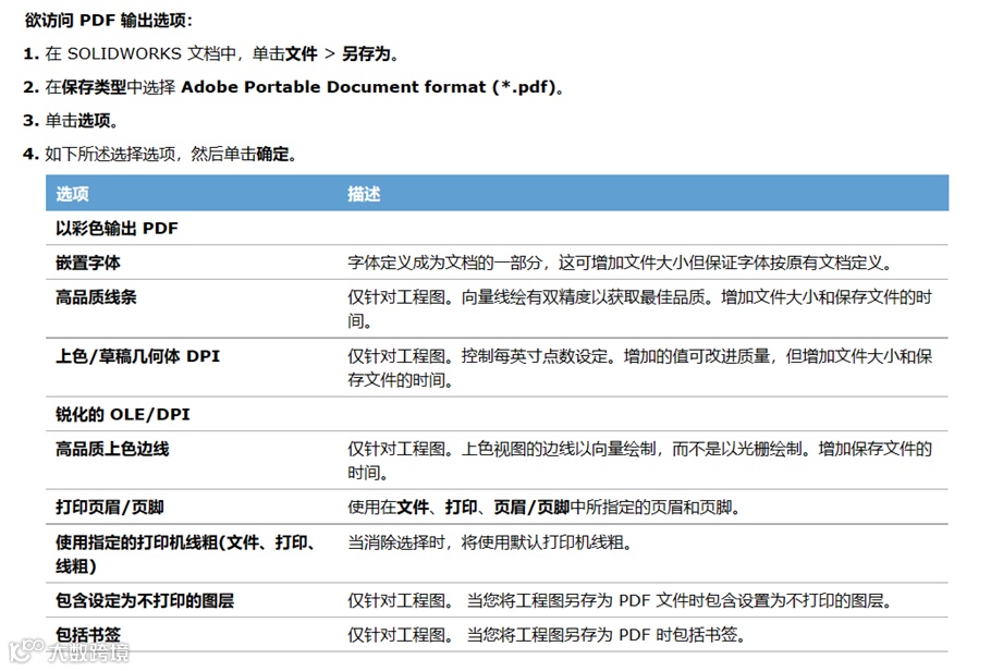 在SOLIDWORKS系统选项-导出-PDF中,提供了以下这些选项,让我们可以根据我们的实际情况去选择,参照下图,我们也可以知道每个设置有什么作用等。