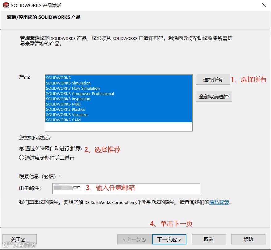 选择所有产品,保证电脑联网状态,单击“下一页”进行激活。如图5所示。