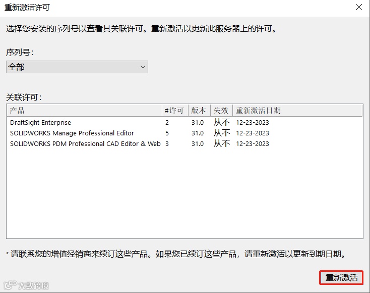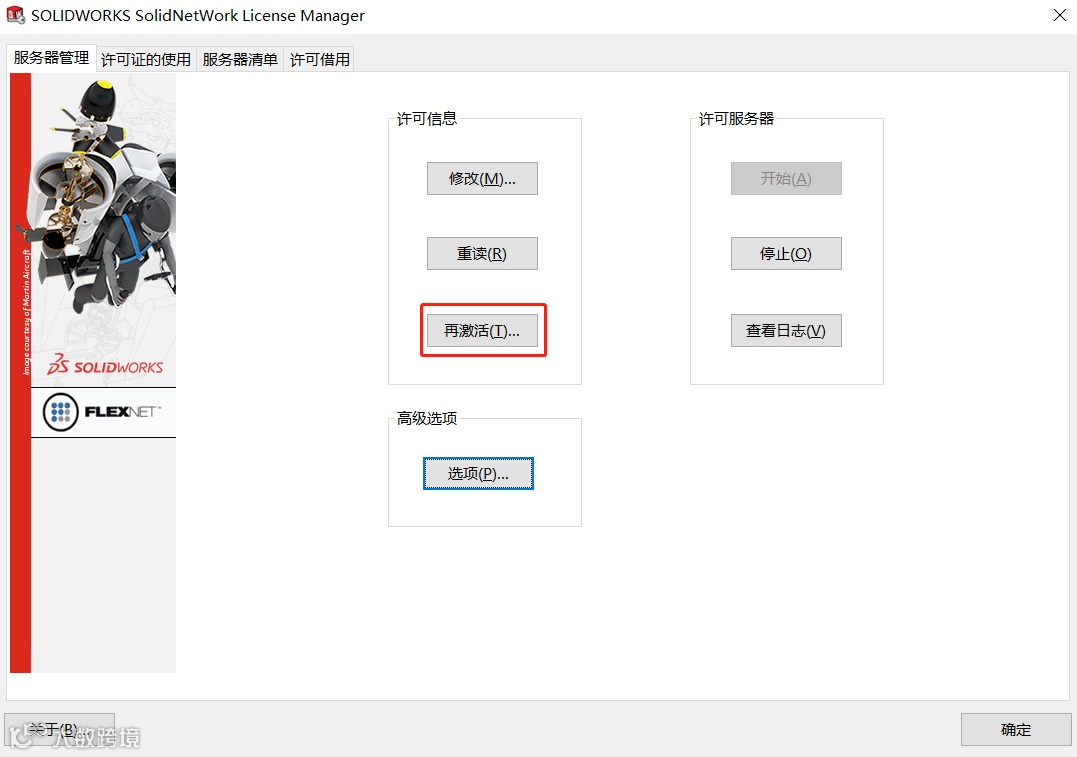 SolidNetWork License Manager Server较以往版本增加【再激活】选项,单击【再激活】,如图8所示: