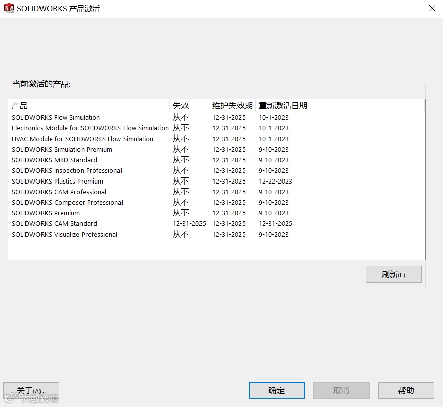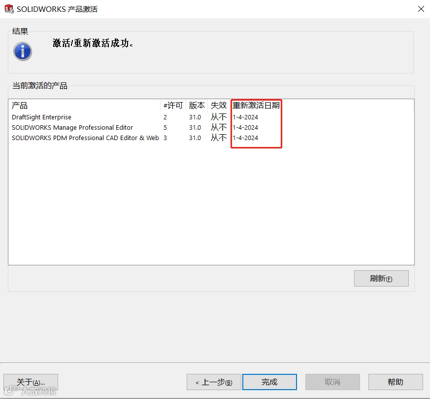 其实在SOLIDWORKS 2022版本开始新增每年必须重新激活一次的要求。第一次激活2022或更高版本的SOLIDWORKS时,在产品激活界面会多出一列【重新激活日期】,但授权还是永久的,【失效】一列显示“从不”,如图2所示。只要在到期前重新激活一次软件就可以继续使用。