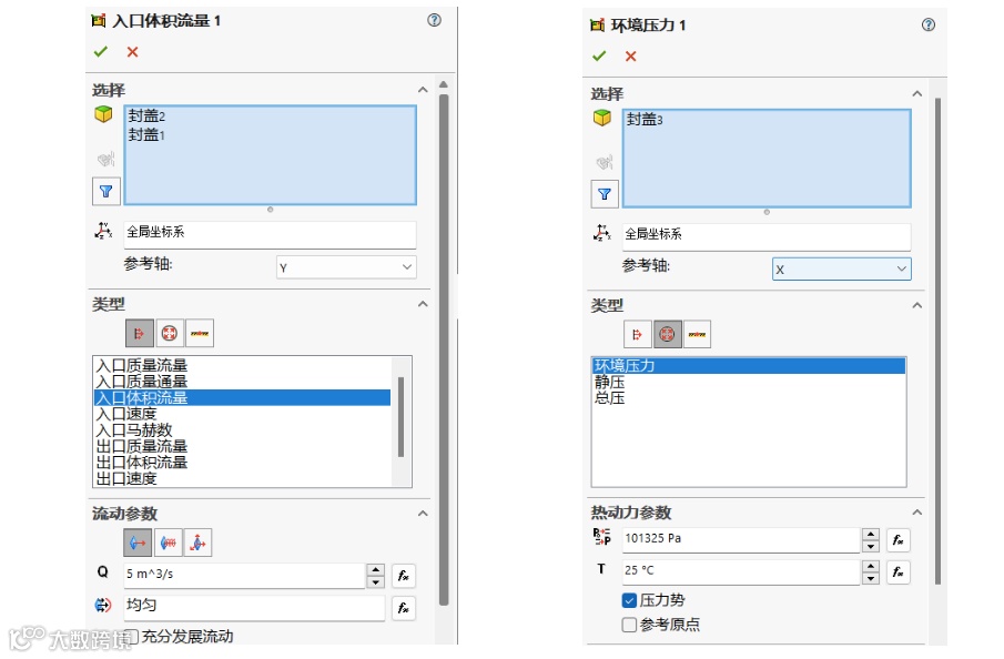 根据本例给出的条件,设定双窗入口体积流量为5m³/s,单窗出口为环境压力;设定体积流量、速度为分析目标。