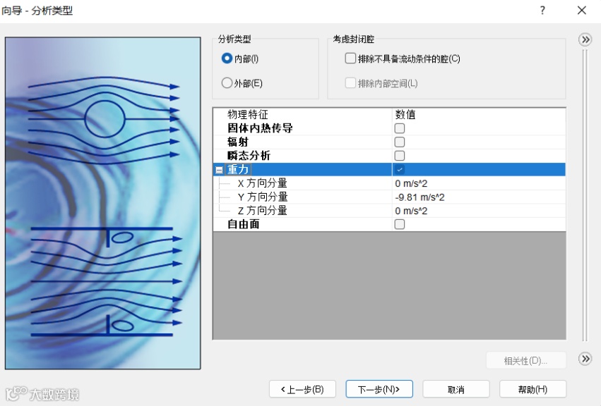 通过向导您可以逐步设置相关参数,例如单位、分析类型、分析介质等,根据本例给出的初始条件,设置分析类型为内部分析,考虑重力影响,选择空气为分析介质,设定环境温度为25度,其他参数可以保持默认。