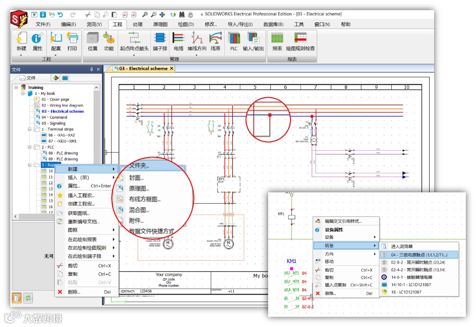SOLIDWORKS Electrical Schematic为您提供强大的电气原理图设计工具。SOLIDWORKS Electrical基于SQL数据库,可轻松实现项目中符号、图框、报表做统一规范化管理。