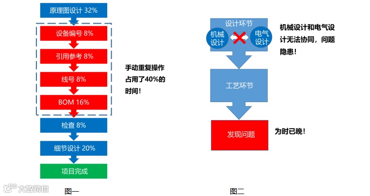 在您的电气项目设计过程中,有多少时间是在“设计”?又有多少时间是在“绘图”?您的电气部分和机械部分在设计过程中有过协同吗?还是设计完成后出现问题才迫不得已进行“协同”?利用传统CAD工具进行电气设计,大量编号、标注、引用、报表需要手动制作,真正用在设计上的时间可能只有三分之一大量时间都浪费在这些重复性工作上(如图一);