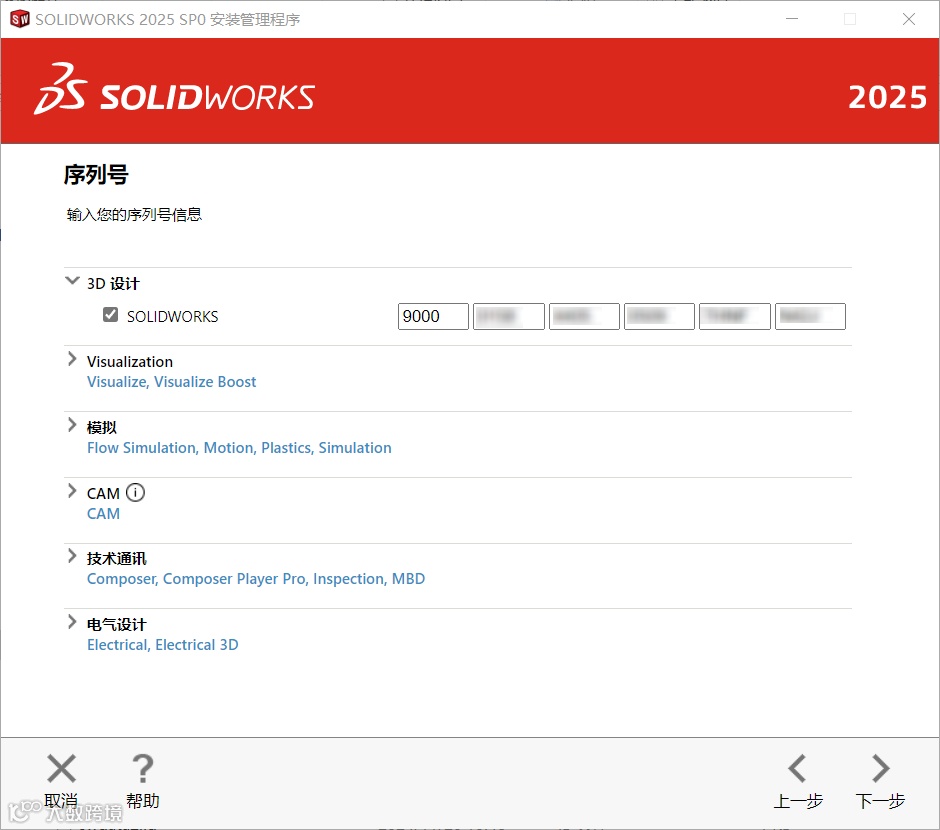 3、输入SOLIDWORKS序列号,单击“下一步”。如下图所示(旧版本界面会有所不同具体以实际为准)。