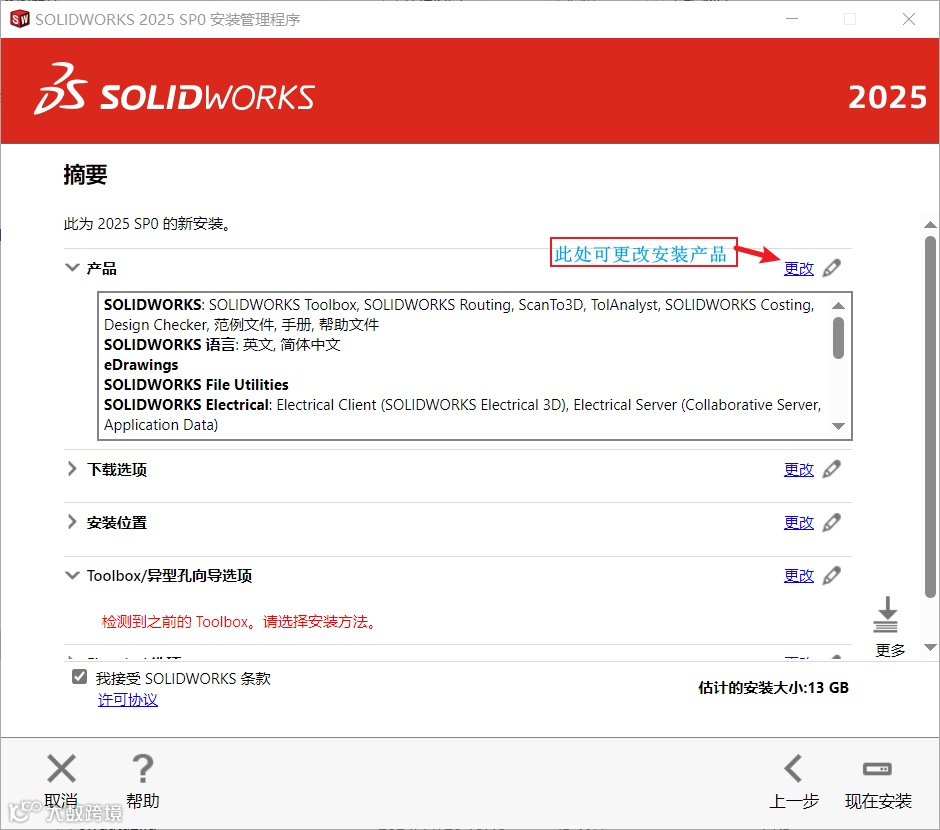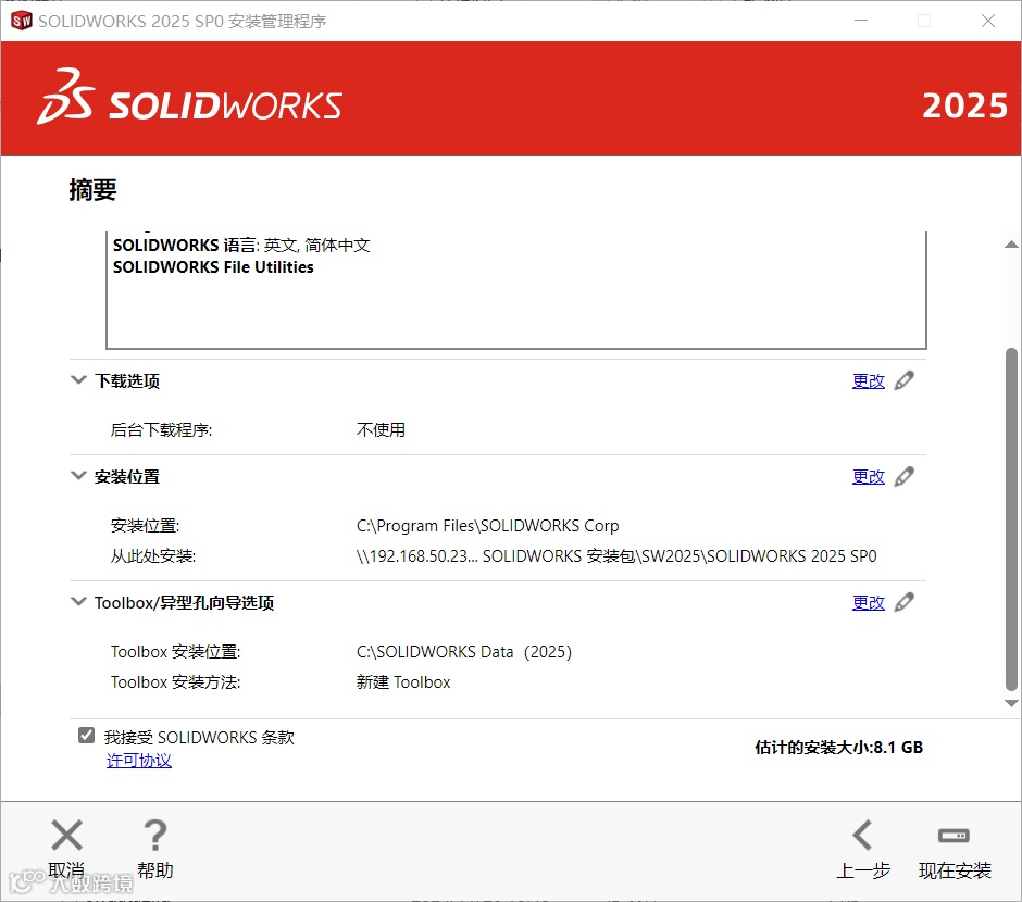 6、此外还可以自定义更改“下载选项”、“安装位置”、“Toolbox安装位置”,确认好安装位置后然后勾选“我接受SOLIDWORKS条款”,再单击“现在安装”。如下图所示(旧版本界面会有所不同具体以实际为准)。