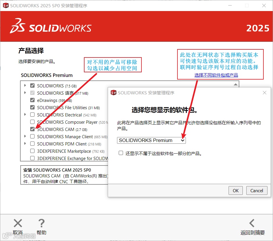 4、将连接到SOLIDWORKS服务器验证序列号及对应软件包,如下图所示。若无网状态会出现警告,选择“否”继续(旧版本界面会有所不同具体以实际为准)。