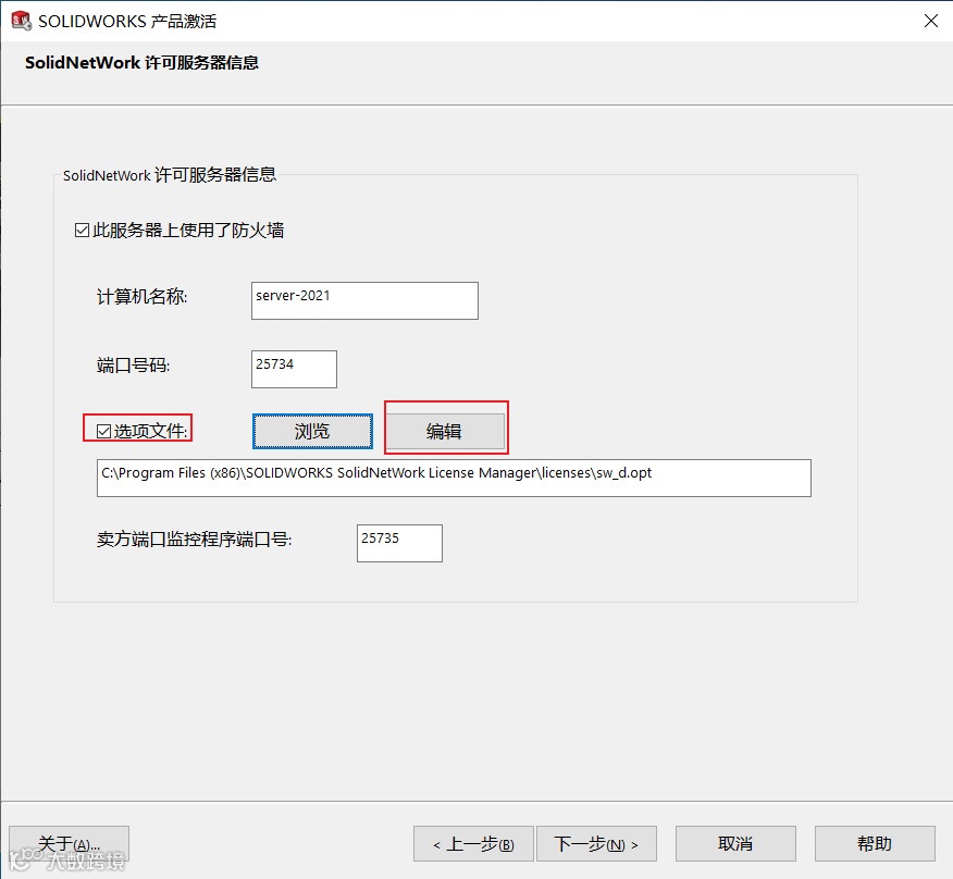 (如果没有选项文件也可以在这里创建opt文件。opt文件保存路径为:C:\Program Files (x86)\SOLIDWORKS SolidNetWork License Manager\Licenses\sw_d.opt)