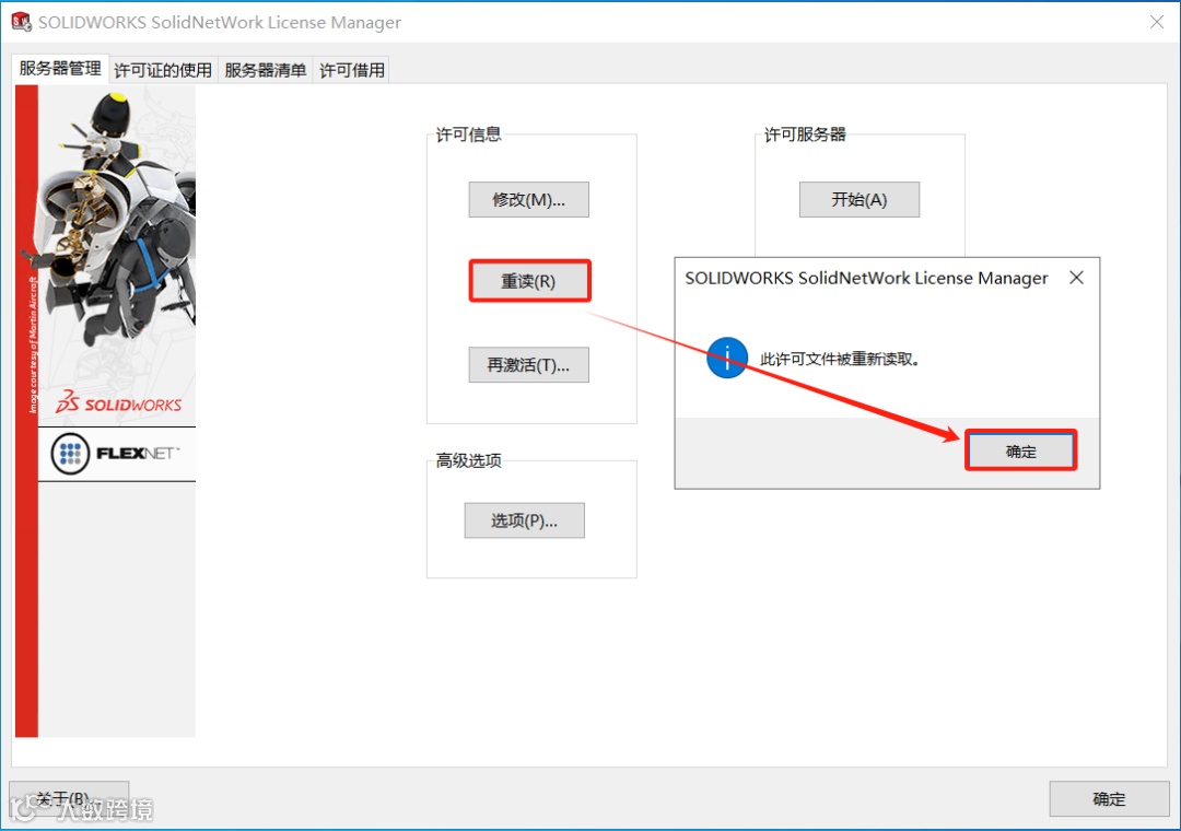 6、在SolidNetWork 许可管理器界面中点击【重读】,弹出“此许可文件被重新读取”,点击【确定】完成设置。