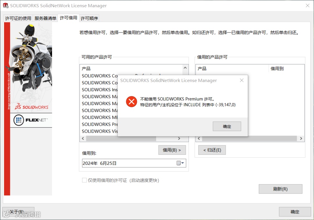 7、查看设置效果。在客户端打开SolidNetWork许可管理器,在许可借用中尝试借用SOLIDWORKS 钣金版许可,系统提示不能借用则设置成功。
