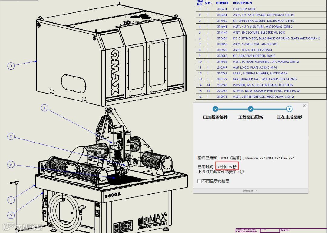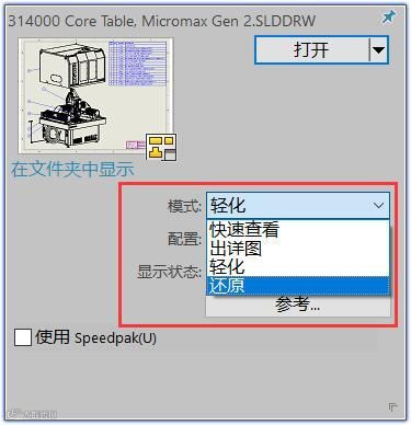 轻化模式的打开方式,工程图只有部分模型数据装入内存。其余的模型数据将根据需要装入。 因为仅在需要时才装入所有模型数据,所以轻化工程图的模式效率会更高。但是当模型过大的时候,即使是部分信息的载入,依然会耗费大量的运算资源和时间。