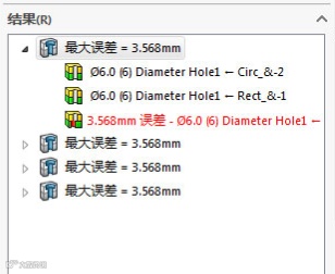 结果内显示检测到的未对齐情况并报告各组未对齐孔中心之间的最大误差。