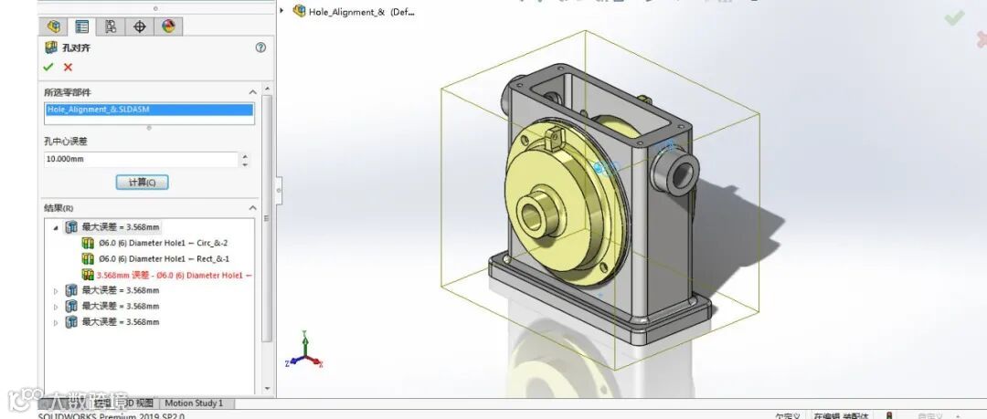 孔对齐检查装配体中是否存在未对齐的孔,孔对齐以特征为基础,检查异型孔向导孔、简单直孔和圆柱切除特征的对齐情况。