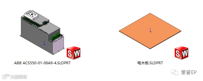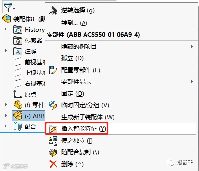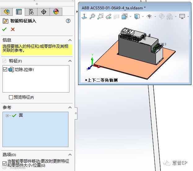 6、再新建一个装配体,插入一块预告绘制的板,插入“ABB ACS550-01-06A9-4”智能零件,右键“插入智能特征”,选择一个面,点击“确定”。