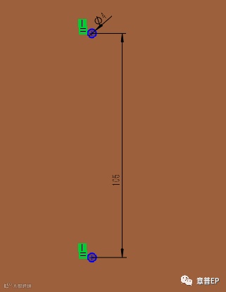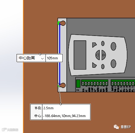 3、打开“电木板”零件,在板上绘制两个两个圆,直径为4mm,大小根据实际情况定,间距为105mm,两圆心添加竖直约束,该草图可以不用完全定义,制作两个通孔。如图1-3所示。